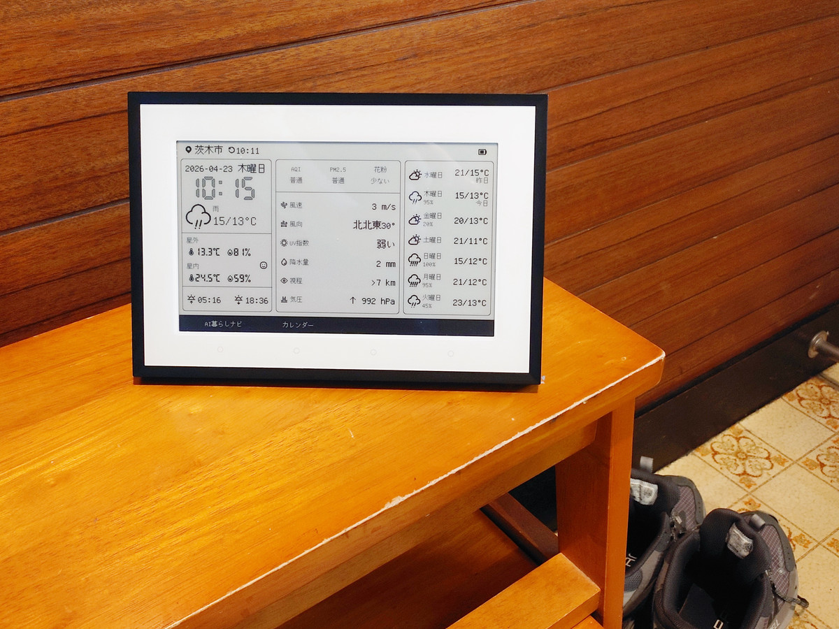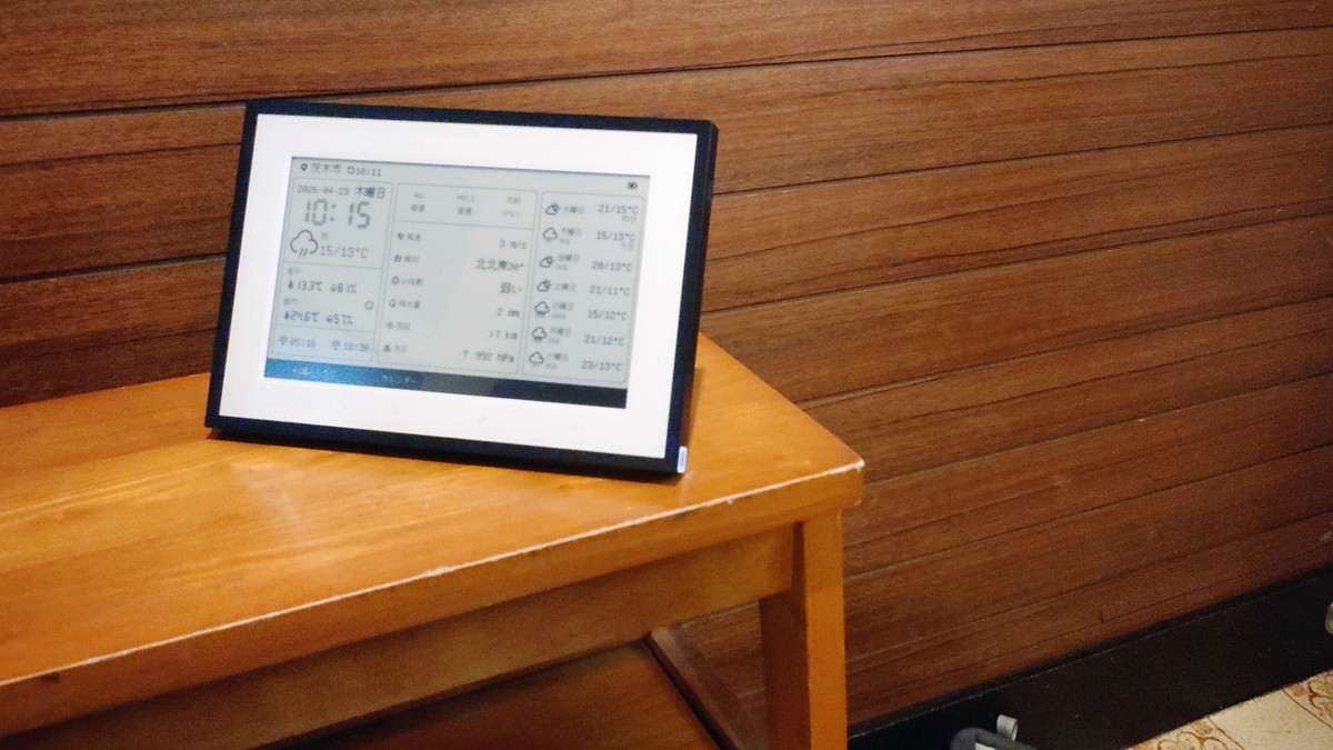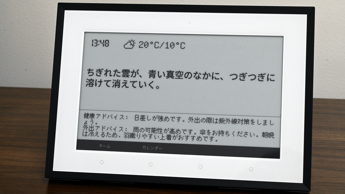 天気予報にしてもスケジュールにしても、スマートフォンがあれば確認は可能ですが、「スマートデイリーステーション」は特定のアプリを起動したりサイトを見に行ったりしなくても、複数の情報をまとめて取得して一覧表示してくれるという点がポイント。バッテリー持ちがよくて常時の給電が不要であり、スタンドを使った設置にも壁掛けにも対応しているので、ほどよく目に入る場所に設置しておくだけで、生活の中の情報取得を助けてくれます。