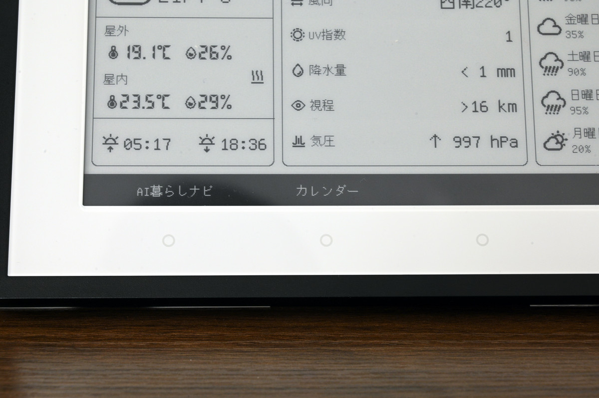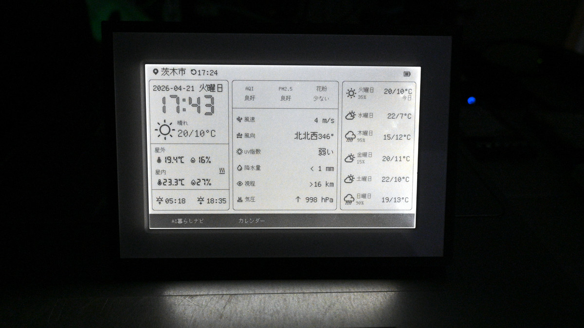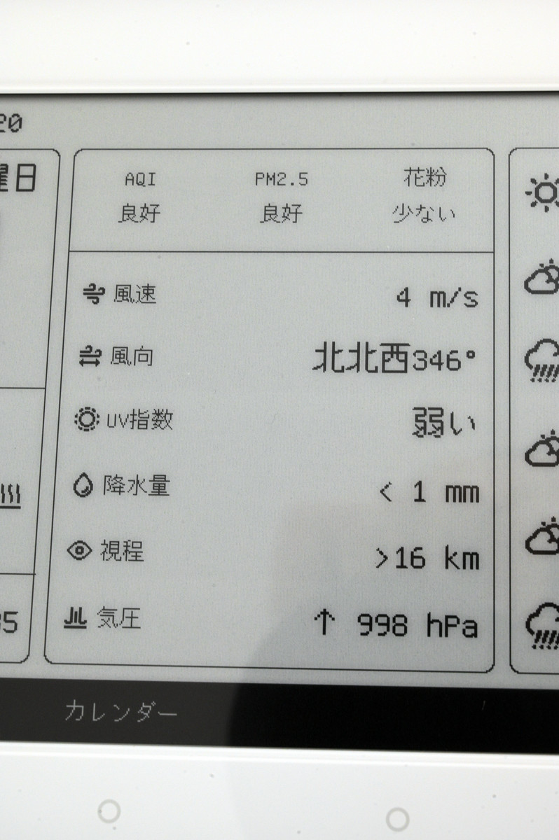 基本画面はこんな感じ。左カラムに日付・時間・当日の天気や気温・日の出と日の入り時刻が表示されます。中央カラムはAQI(大気汚染指数)・PM2.5・花粉・風速・風向・UV指数・降水量・視程・気圧。右カラムが週間天気と降水量表示となっています。情報は上部ボタンを2秒長押しすることで手動更新できるほか、3時間ごとに自動更新されます。