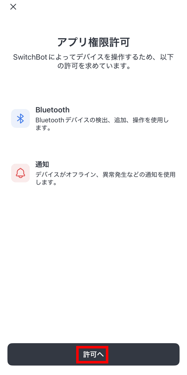 初回起動時は権限を求められるので「許可へ」をタップ。