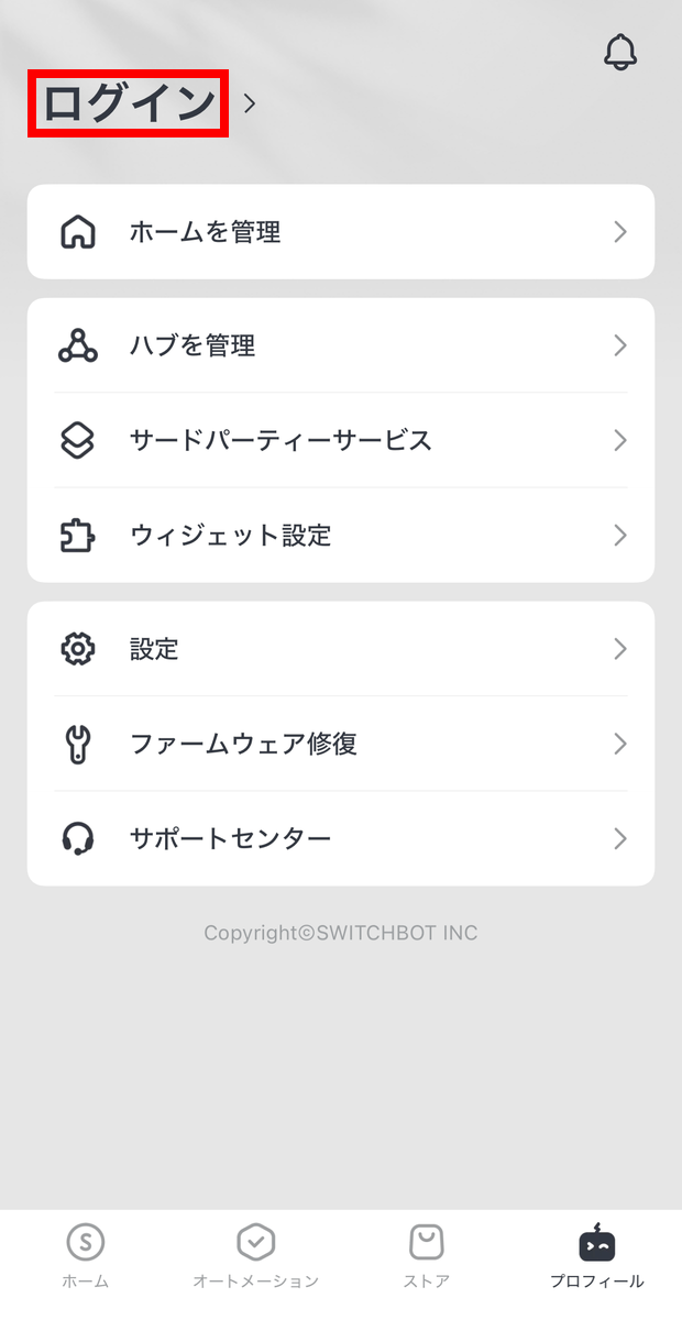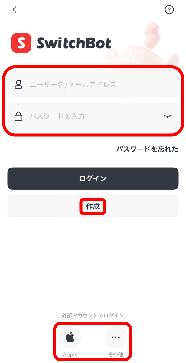 SwitchBotアカウントをすでに持っている人はユーザー名・メールアドレスと入力してログインすればOK。持っていない人は「作成」からアカウントを作るか、外部アカウントでログインしてください。外部アカウントとしてはApple、Google、Amazonが利用可能です。今回は新しくSwitchBotアカウントを作成しました。