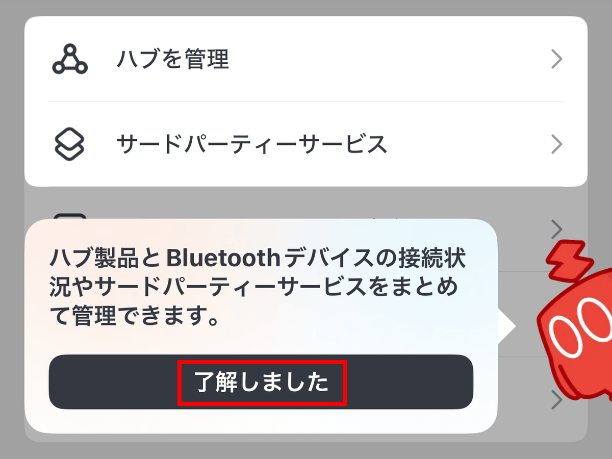 「了解しました」をタップ。この赤いキャラクターがいるうちは、そばに表示されるバルーンをタップしていけばOK。