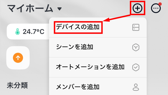 アプリでホーム右上の「+」をタップし、プルダウンメニューから「デバイスの追加」をタップ。