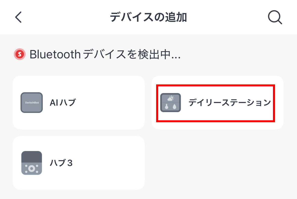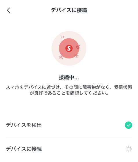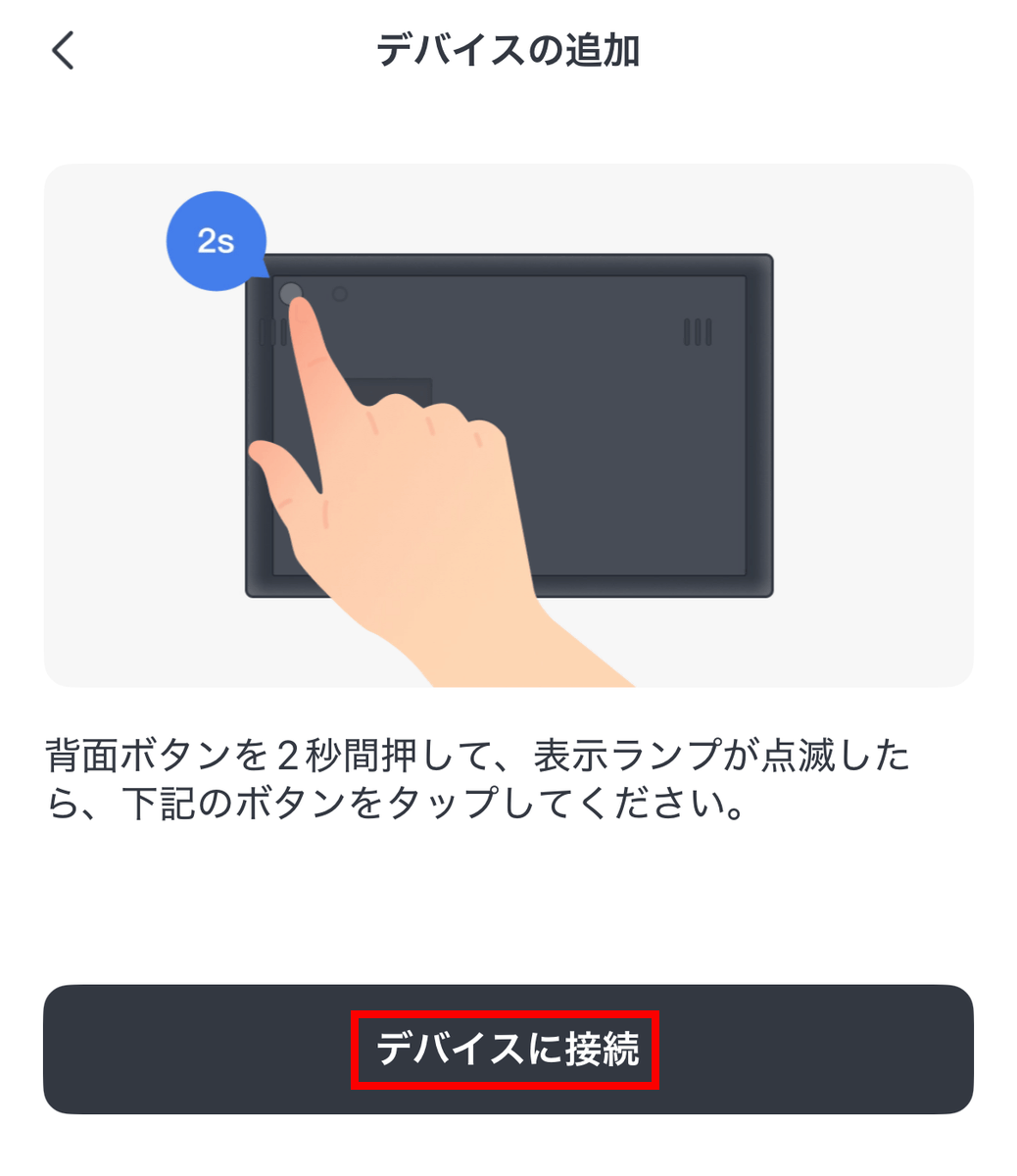 画面の案内に従って、スマートデイリーステーション背面の「デバイス接続ボタン」を2秒長押しして、表側のLEDが点滅したら「デバイスに接続」をタップ。