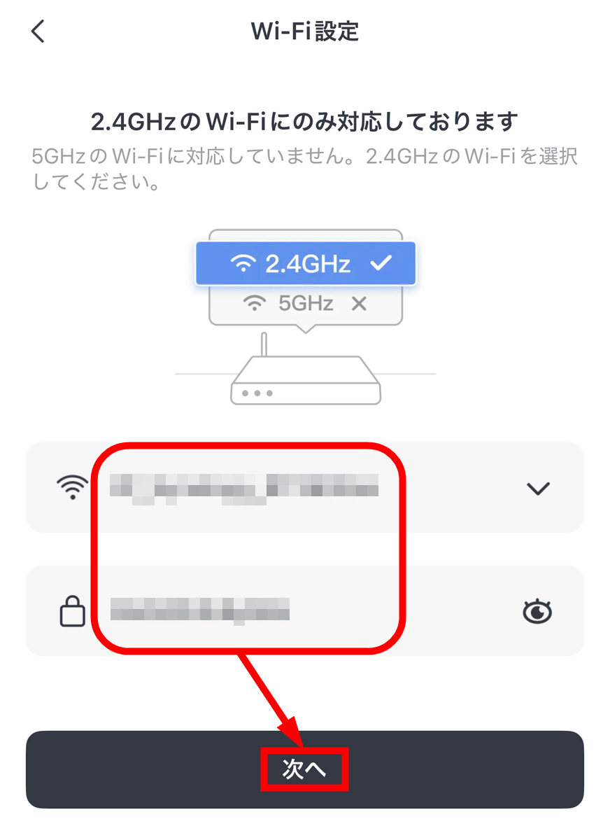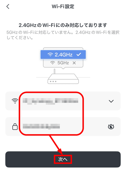 接続するWi-FiのSSIDとパスワードを入力して「次へ」をタップ。SSIDはプルダウンメニューから選べばOKです。