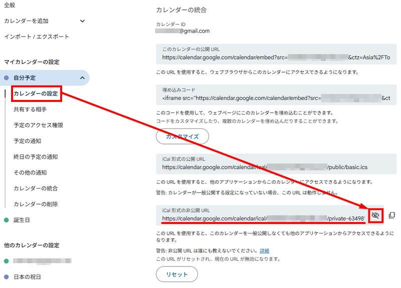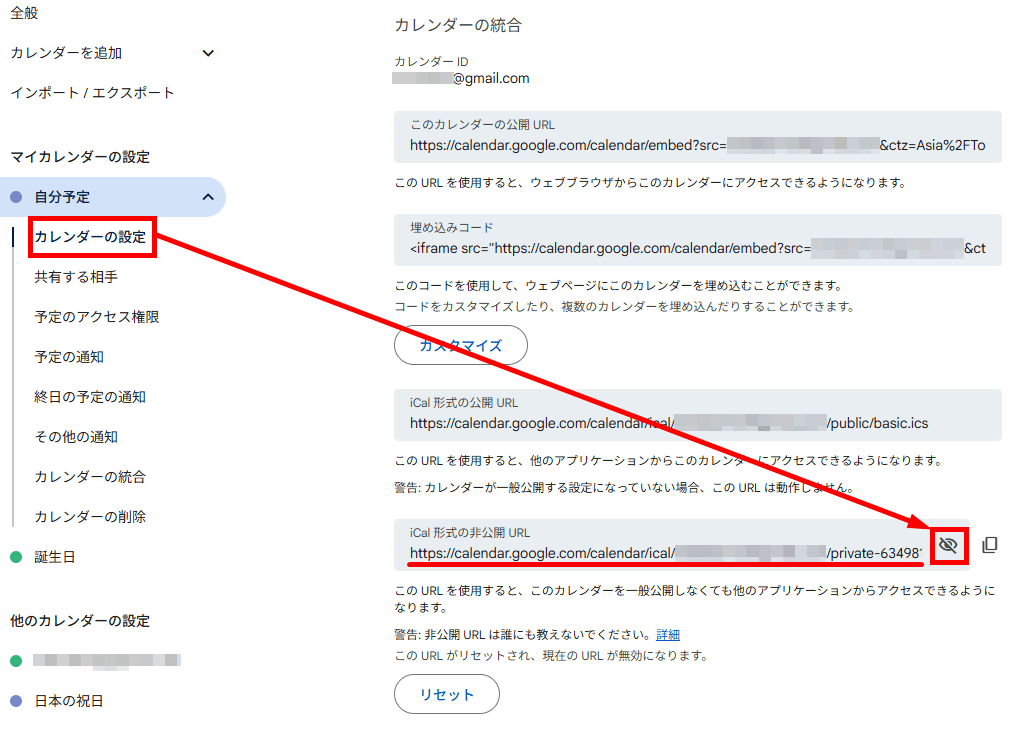 同期したいカレンダーの「カレンダー設定」を開き、「iCal形式の非公開URL」の右にある目のアイコンをクリックして、URLを表示します。末尾の「basic.ics」まで、いったん控えておきます。