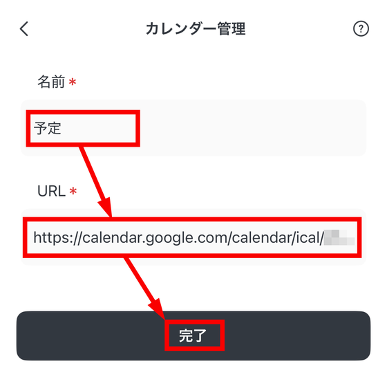 表示名と先ほどのiCal形式の非公開URLを入力し、「完了」をタップ。