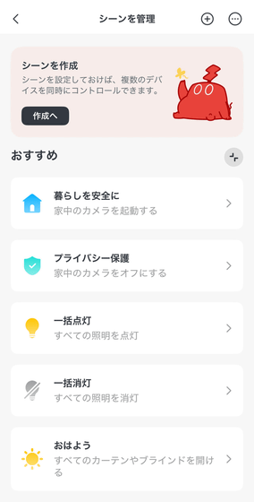 家中のカメラを起動する「暮らしを安全に」や、カメラをオフにする「プライバシー保護」、すべての照明を点灯する「一括点灯」とすべての照明を消灯する「一括消灯」など、12種類のプリセットが用意されています。