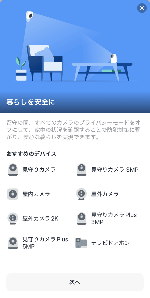 「暮らしを安全に」の場合、SwitchBot製の見守りカメラ・見守りカメラ 3MP・屋内カメラ・屋外カメラ・屋外カメラ 2K・見守りカメラ Plus 3MP・見守りカメラ Plus 5MP・テレビドアホンと連携可能です。