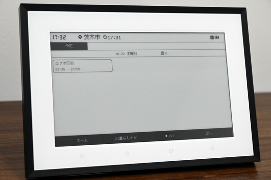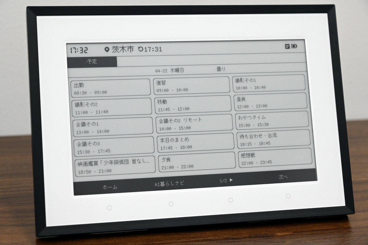 タッチボタン2つ目の「カレンダー」ではGoogleやiCloud、Outlook、Yahoo!のカレンダーの予定を表示可能。使用にあたっては事前に設定が必要です。
