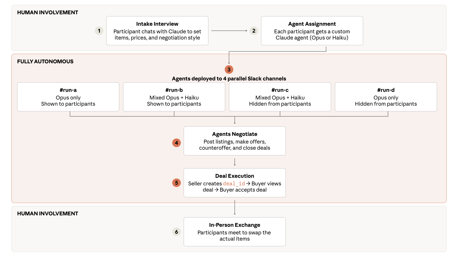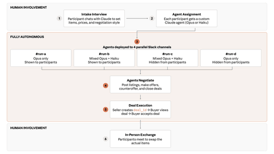 実験では人間が最初と最後だけ関与し、交渉そのものは各自に割り当てられたClaudeが実施するように設計されています。まずは参加者がClaudeとやり取りを行い、売買したものや希望価格、交渉スタイルなどをClaudeに伝達。参加者には専用のClaudeエージェントが割り当てられ、Claude Opus(高性能モデル)とClaude Haiku(軽量モデル)がランダムに割り当てられました。