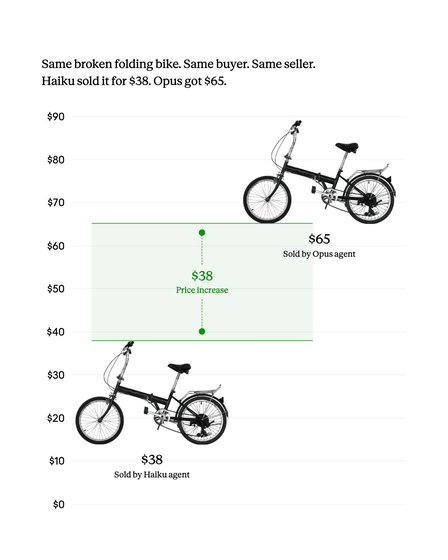 Anthropicは「AIモデルの品質は取引において非常に重要でした。OpusとHaikuが互いに交渉するシミュレーションでは、Opusが大幅に有利な取引を得ました。興味深いことに、我々の調査の参加者はこの差異に気づきませんでした」と述べ、より高性能なAIモデルが優れた取引を行ったと説明しています。実際、同様の物品(自転車)をOpusは38ドル(約6100円)も高く売ることができました。
