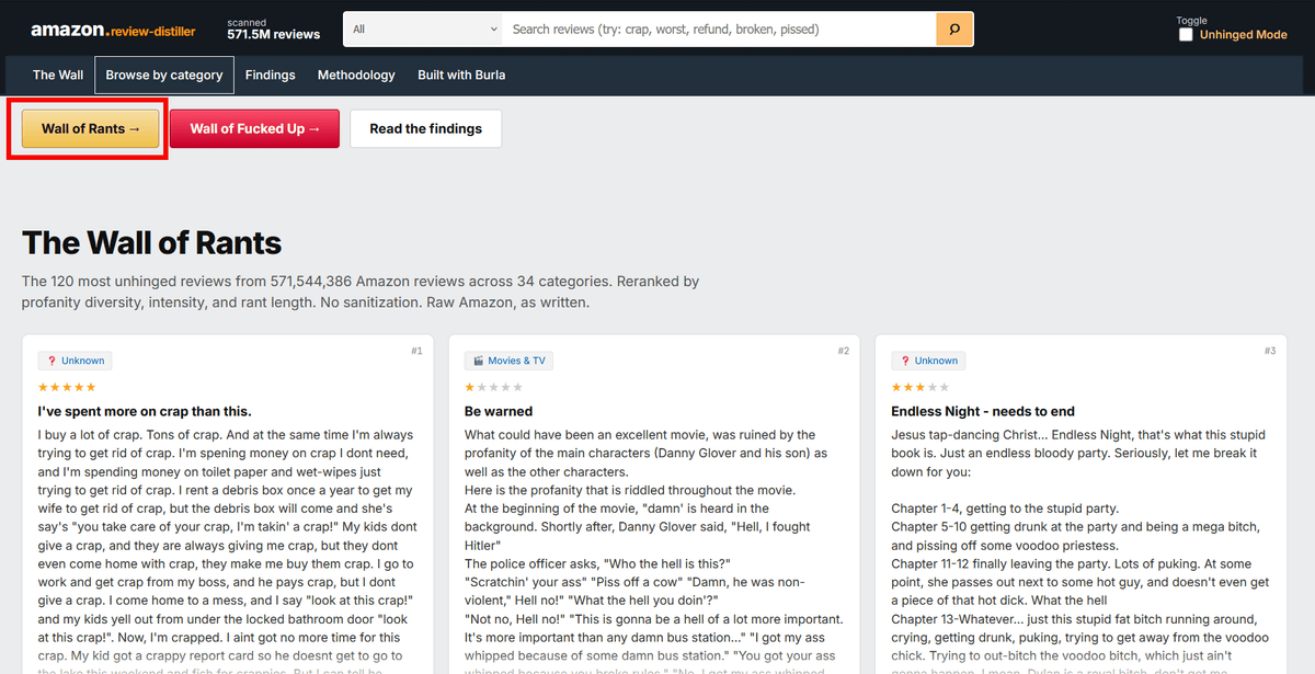 Amazon Review Distillerでは「Wall of Rants(文句の壁)」として、悪口の多様性や激しさ、文句を言う文章の長さなどに基づいた上位120件のレビューを表示しています。例えば、「星5」の評価をしているのに日常の愚痴を延々と書き連ねているレビューのほか、「Hunger Games」というCDは全体の平均で星4.5の高評価ですが中には「凡庸さがトイレに吐き気を催すほどのクソのレベルに達している」と汚い言葉で低評価するレビューもあります。また、「ASUS ROG Swift PG27AQ 27」というモニターについて「ライターで燃やす方がイライラも少なく楽しめるくらいクソ」という星1レビューもあります。ただ、中には「この映画には下品な表現が多い」と指摘したレビューで実際に映画に登場する下品な表現を列挙したことで多くフラグ付けされたレビューなどもあります。