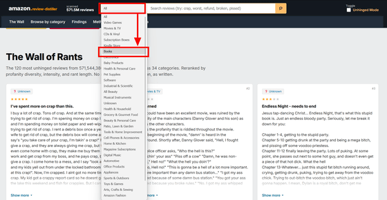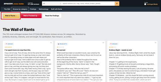 「Amazon Review Distiller」は5億件以上のAmazonレビューを抽出・解析することで「めちゃくちゃなレビュー」をカテゴリごとに選出しています。サイトではAmazonに近いUIで各カテゴリの特にひどいレビューを見ることができるほか、「レビューに汚い言葉が多いカテゴリ」「レビューの文字数が多いカテゴリ」などの集計を見ることができます。