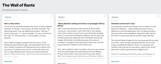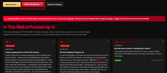 「Wall of Fucked Up」をクリックするとサイトが黒と赤のカラーに変わり、「常軌を逸したレビュー」が表示されました。差別や激しいののしり言葉を含む、さらにひどい内容のレビューが一覧になっています。