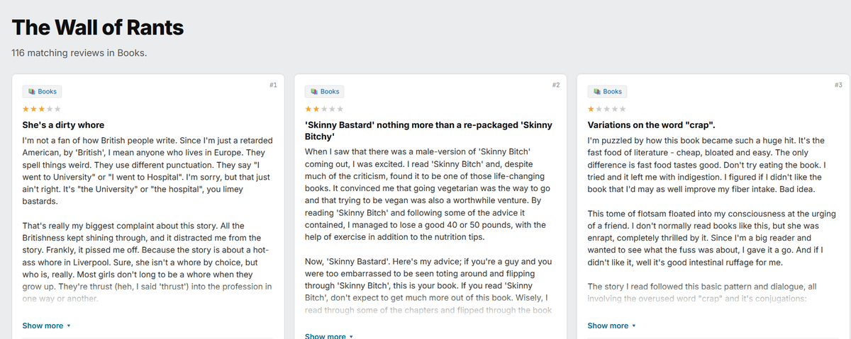 そのほか、「最も連続して感嘆符が使われているレビュー」や「少ない文字数で怒りを表現したレビュー」、「悪口と下品な言葉の割合が多いレビュー」など、さまざまな観点でレビューが順位付けされています。