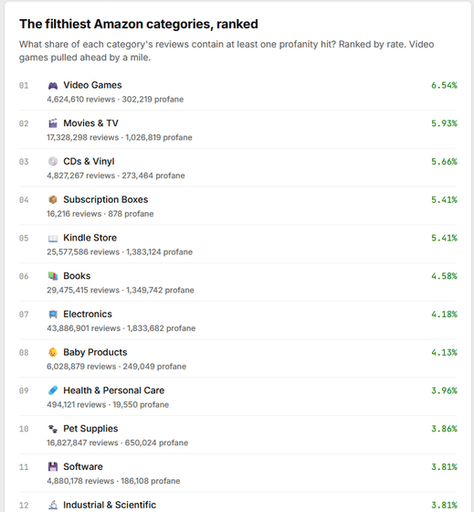 Amazon Review Distillerによると、各カテゴリーの商品に寄せられたレビューのうち「少なくとも1つの下品な言葉が含まれているもの」の割合が最も多かったのは「ビデオゲーム」で6.54%、次が「映画&テレビ」で5.93%でした。