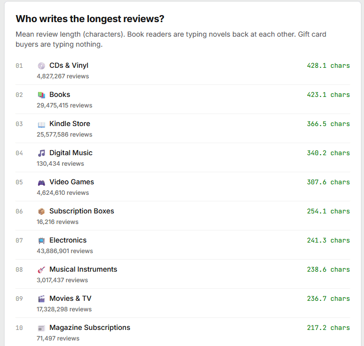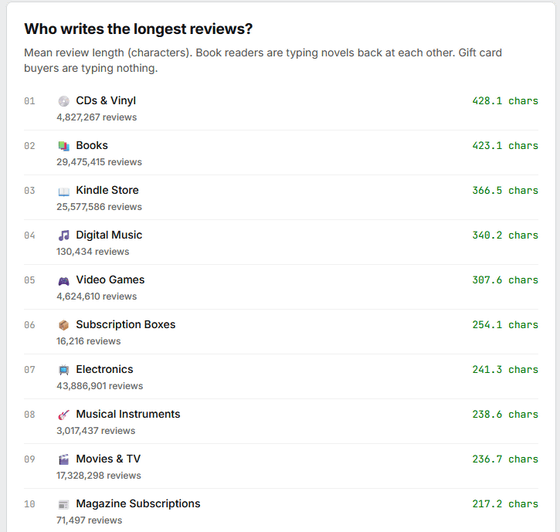 レビューの平均文字数が多いのは「CDとレコード」や「本」「Kindleストア」「デジタル音楽」「ビデオゲーム」と、芸術・作品系のカテゴリが上位を占めています。
