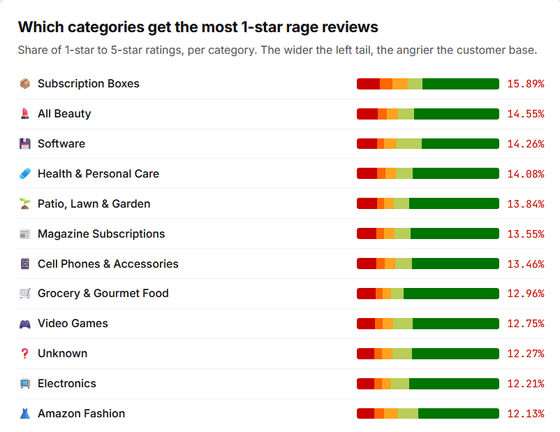 また、星1レビューの割合が多いのは「定期購入」に関するカテゴリのほか、「美容」「ソフトウェア」「健康・パーソナルケア」が上位となっていました。